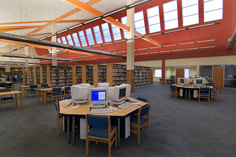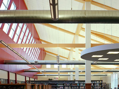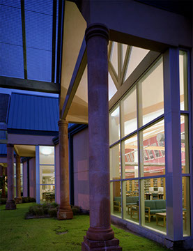 Front entrance canopy of Speer Memorial Library in Mission, TX.