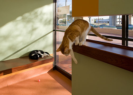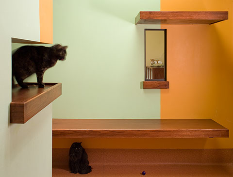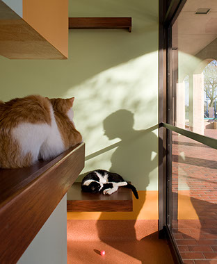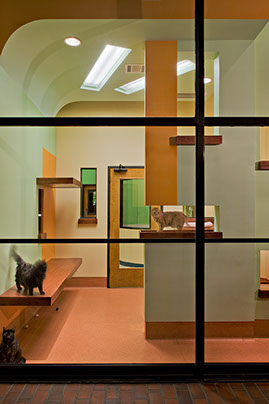 The contemporary aesthetic provides a playful environment for cats and visitors alike, as well as updating the street front view of this facility.