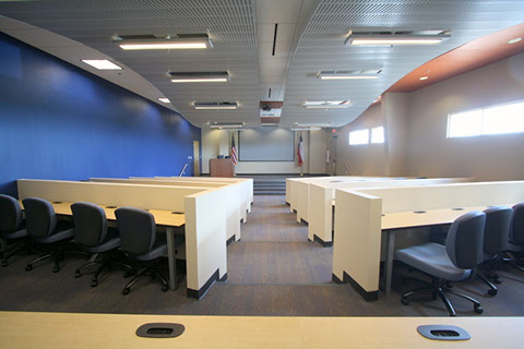 ceiling element and bright colors to add interest to the space. Natural light, which can be controlled by shading devices during audio/visual presentations, is provided through high exterior windows to make the space brighter and offer a visual connection to the outdoors during regular lectures and training sessions. The facility also includes a secure component where local police can access their database and write reports.