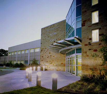 Front entrance of APD substation, forensics science center, and vehicle examination facility.